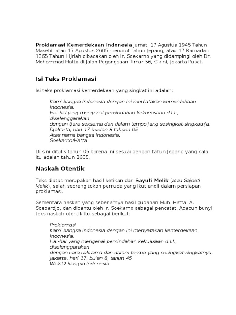 Berikut isi, gambar & bunyi teks naskah proklamasi indonesia, sejarah proses perumusan dan pembacaan serta penyebaran proklamasi indonesia pada tanggal 17 agustus 1945 (lengkap) Minggu, 16 agustus 2020 14:15. Sebelum naskah pernyataan kemerdekaan ri dibacakan pada 17 agustus 1945, terdapat serangkaian peristiwa penting yang juga wajib kamu ketahui, detikers. Teks proklamasi atau naskah proklamasi klad merupakan tulisan tangan asli dari soekarno sebagai pencatatnya. Apr 14, 2019 · pembahasan lengkap 2 jenis teks proklamasi kemerdekaan indonesia, versi naskah klad (tulisan tangan soekarno) dan versi naskah otentik/asli (hasil ketikan sayuti melik).